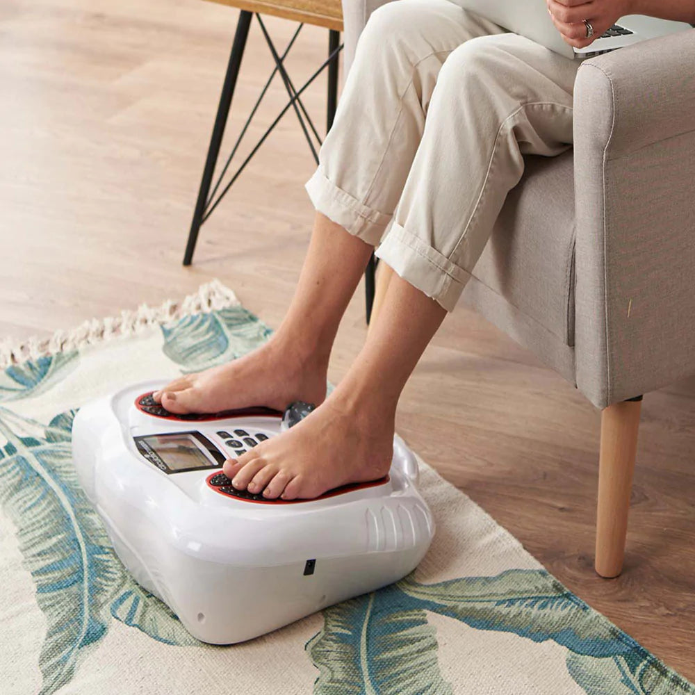 Para usarlo solo tiene que sentarse y colocar los pies descalzos en los dispositivos para los pies. Ambos pies tienen que tocar las almohadillas del dispositivo para que empiece a funcionar y usted sienta la vibración. No importa si sus piernas son más grandes que la placa para las piernas, o sin son más pequeñas y no las cubren completamente. Los impulso eléctricos son iguales en todas las secciones de la placa para los pies. Mientras sus pies estén en contacto con el dispositivo, usted sentirá los impulsos correctamente.